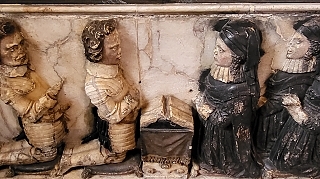 The most impressive funerary monument is the memorial to John Leventhorpe and his wife Joan, who died in 1625 and 1627 respectively. Within a multi-coloured marble frame, both of the deceased are depicted reclining on their left sides with their heads propped up by their left hands. John holds a sword in his right hand and Joan a small book in hers, Beneath the two statues, the couple’s six sons (one of whom, Arthur, died as a baby) and eight daughters are depicted in bas-relief, all kneeling in prayer. Baby Arthur is also present on the memorial but has been sculpted much smaller than his brothers. The whole sculptural ensemble is magnificent, and if you had time to see only one thing in Sawbridgeworth, this should not be missed.