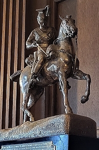 Sir Walter had the house repaired and filled it with furniture and objets d’art appropriate to the age of the house. The result was a comfortable home with fascinating contents. One of the many objects that caught my eye is a trophy depicting a military man on a horse. This item bears an engraved plate: