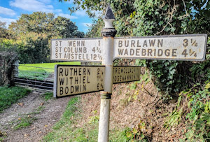 Where we are staying in Cornwall this October (2022) there is a finger post at a T-junction where one road meets another slightly larger one. The fingerpost at this junction ought to have three arms, one pointing along the road that ends here, and two for the larger road. However, the sign has four arms. One of them, pointing to Trewollack and Rosenannon appears to point where there is no road but the entrance to a farmer’s field without even a footpath crossing it.