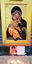 The icon in Truro shows the Virgin Mary dressed in dark blue and Jesus dressed in red. Our guide in Piana had shown us that in all the icons, the same thing can be seen. Conventionally, in Byzantine icons, Jesus is almost always dressed in red and the Virgin Mary in blue. The copy of the icon on display in Truro Cathedral is no exception to this tradition.