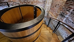 There are two ways to reach the upper floor from the lower one. And it is the design of these that really impressed me. There is a spiral staircase, whose treads are cantilevered from a central timber cylinder. Bands of metal surround the cylinder in the same way that similar bands can be found binding the timber elements of wooden barrels. This design was chosen to commemorate the former existence of Rainham Hall’s brewhouse (brewery).