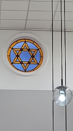 If you look at the circular panes carefully, you will notice that, almost obscured by the paint, there is a six-pointed star, the Jewish Magen David. Inside the building, there is a large hall flanked by galleries at the first-floor level. The galleries are supported by metal columns topped with decorative capitals. High up on the east wall of the building, there is a circular stained-glass window. The glass depicts a Magen David: it has not been concealed by paint.