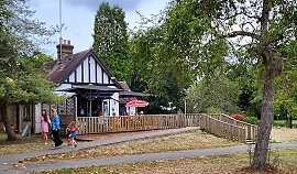 The park consists mainly of spacious grassy meadows that are bordered to the north by dense bushes and trees lining the bank of the Brent. Amenities offered in the park include, tennis courts, outdoor exercising equipment, and an attractive children’s play area. Housed in a small building with fake half-timbering, there is a small café with a terrace on which there are tables and chairs. The ‘caf’ offers hot and cold drinks and a few snacks. Its staff are pleasant, and the washrooms were clean.