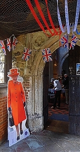 We travelled (on a train bound for Heathrow Terminal 5) to Hayes and Harlington station, and from there headed to Barra Hall Park in the old part of Hayes. There, we enjoyed a picnic before walking to the mediaeval parish church, St Mary the Virgin. We had visited it once before, but were completely unprepared for what we saw this time. The hedges lining the path leading to the south door of the church were decorated with bunches of cut flowers. A cardboard cut-out of Queen Elizabeth II greeted us at the door. The lovely church was filled with attractively arranged bouquets of flowers. Quite by chance, we had arrived whilst the church’s 57th annual Festival of Flowers was being celebrated. We were fortunate because we arrived on the 3rd of July, the last day of the festival. The festival’s theme was “A Tribute to Queen Elizabeth”. How appropriate to have travelled to it on the Elizabeth Line.