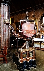 One item in the church, which is particularly eye-catching, is made of wrought iron and hammered (repoussé) copper. It is a lectern with two large arms on either side of the leather-covered book holder. These are supports for large candles. The lectern is approached by a small set of stairs whose treads have studs on them. The studs are arranged to spell out words, which I found difficult to decipher. The part of the base facing the congregation is an intricately decorated folded screen with Arts and Crafts Style decorative motifs. Most probably handmade, the lectern, although fantastically crafted, has a very slightly amateurish look about it. It is more unusual and eye-catching than beautiful.