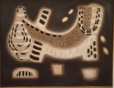 The Estorick displays five of Music’s paintings. They were created between 1951 and 1983 and illustrate his versatility as a painter. All the paintings hanging are between abstract and figurative in style, but slightly nearer the latter than the former. I had seen his paintings on previous visits to the Estorick, but until my most recent viewing of his art, I had not been aware of how many aspects of his life mesh with things that interest me.