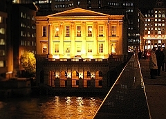 THE PRESENT FISHMONGERS Hall at the northern end of London Bridge was constructed in 1827, following the completion of the London Bridge, which now stands in Lake Havasu City in Arizona (USA). Built in a neo-classical style, the Hall, which faces the Thames and King William Street, was designed by Henry Roberts (1803-1876), assisted by a young architect who would later be known as Sir George Gilbert-Scott (1811-1878).