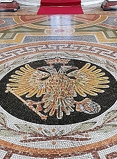 With many features borrowed from Italian Romanesque architecture, and some from Byzantine designs, the edifice at Wilton, despite being an Anglican parish church, felt to me slightly more like an Orthodox church than the converted ex-Anglican, now Orthodox, church in Ennismore Gardens Mews. However, the interior fittings in the church in Wilton borrow from what can be found in traditional Italian churches rather than in typical eastern Orthodox churches. But, the mosaic covered cupola over the chancel in Wilton’s Anglican church, with its depiction of Christ with two saints resembling what is often found in Byzantine churches, contrasts with the undecorated cupola over the chancel in what has now become the Russian Orthodox Cathedral in Kensington.