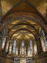 Until we attended an exhibition in the Fitzrovia Chapel in late May 2022, we had no idea that this small architectural gem existed. Along with nearby All Saints in nearby Margaret Street, the Fitrovia, a treasure chest with its sparkling golden ceiling, should not be missed by lovers of Victorian architecture and/or fine mosaic work (as well as masterful use of inlaid stonework).