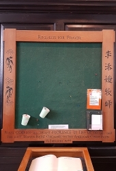 In the southwest corner of St Martin’s, I spotted a memorial, which aroused my curiosity. It is a simple green cloth-covered square notice board surrounded by a wooden frame in which various things are carved. These include the words “Requests for prayer”; carved plant motifs; Chinese pictograms; and the words “Praise God for his servant Florence Li Tim-Oi DD. 1907-1992. The first woman ordained in the Anglican Communion 25 January 1944”. There were several notices and a couple of plastic drinking cups pinned on the board.