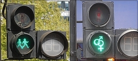 The pedestrian crossing signals in London’s Trafalgar Square are fitted with a variety of different green lights, such as can be seen in the two examples in the photograph. I have not seen these sorts of green signals anywhere else in London. They are a part of a project to promote ‘diversity’ in London.
