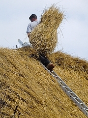 The tradition of covering roofs with thatch continues all over the English countryside. Although most buildings are now roofed with tiles, there are still quite a few that have a covering of thatch. The thatch has to be renewed regularly, This is a lengthy and costly business that can only be carried out by the small number skilled thatchers, who operate around the country. Because of the costliness of maintaining it, having a thatched roof is now a conspicuous sign of wealth, whereas once it was not.