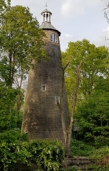 All that remains of the Hounslow Powder Mills is a tall brick tower topped with a lead roof and a small lantern with a weathervane. It resembles a lighthouse. This was built either late in the 18th century or early in the 19th. Lying near it are a couple of circular millstones, which might have been used for grinding gunpowder. Described by some as a shot tower, it might have been used to manufacture lead shot. Molten lead would have been poured through a copper mesh near the top of the tower, and as it fell downwards, it formed into droplets, which when cooled became pellets of lead shot. This is most likely, but others suggest that the tower was part of a windmill.