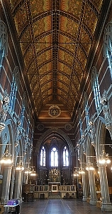Like All Saints Margaret Street, the interior of St Mary Magdalene’s is a masterpiece of Victorian gothic extravaganza, a riot of colour. The nave has a magnificent painted ceiling which includes faces of various saints. This was painted by Daniel Bell, a Victorian artist. Sculptures of saints carved by Thomas Earp (1823-1893) look down on the nave. The floor of the vast nave is decoratively tiled. Street did not believe in fixed pews such as are found in many other Victorian churches and were rented out to parishioners to raise money. He believed in ‘free seating’, especially in a church like St Mary Magdelene’s that was built to serve the poor. The apse is unusual in that it is polygonal, reminiscent of apses that the widely travelled Street had seen in French and Flemish churches.
