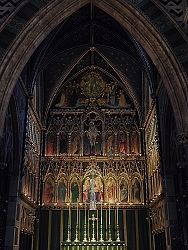 The architect chosen was William Butterfield (1814-1900), who specialised in the ‘gothic revival’ style. The church was built on the site of a former chapel, and within the confined space available, it was accompanied by a choir school and a clergy house. The church’s spire, 227 feet high, is taller than the towers of Westminster Abbey.