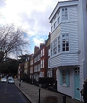 Walking east from the wall of Aubrey House, we pass several places of interest including Wycombe Square. On the south side of Aubrey Walk is the club house of Campden Hill Lawn Tennis Club. This was founded in 1884, only seven years after the first championship competition at Wimbledon. Its twelve courts, six outdoor and the others indoors, are not visible from Aubrey Walk. Almost opposite the club, numbers 38-40, a 20th century art deco style building, contains the former home of the singer Dusty Springfield (1939-1999), who resided there from 1968 to 1972.