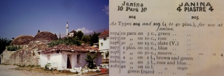 Within the Albanian section of the catalogue there is also an illustration of the over-printing “JANINA. 4 Piastre 4. 205”. Janina is the name of a town now in Greece, Ioannina (Ιωάννινα). In 1912, this town was not in what was then Greece, but in the Pashalik of Janina, part of the Turkish Empire. In February 1913, following the battle of Bizani in the First Balkan War, the town was absorbed into Greece. Many Albanians still consider that by rights Ioannina should be a part of a Greater Albania. The large Albanian population in the town was forcibly reduced by population exchanges in the early 1920s and also the pre-WW2 Greek government’s policy of strongly encouraging people of Albanian ethnicity to regard themselves as Greeks. When I visited Ioannina in the 1970s, there were the remains of Turkish buildings but many of them were in a sad condition. I do not know whether they have been restored since then.