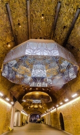One of these was the Stainer Street Walkway that links St Thomas Street and Tooley Street and passes through the station’s foyer from which stairways lead up to platforms. This wide passageway lined with ochre coloured brickwork is now well-lit and apart from being a bit chilly, quite pleasant. But look up, and you will see three enormous, reflective, decorative umbrellas suspended from the ceiling. Each umbrella is decorated with geometric symbols and lettering. The lettering forms sets of words that are supposed to be meaningful for those who bother to read them.