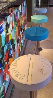 “Similar to its predecessor, which was designed by Barber & Osgerby’s interiors company Universal Design Studio, the interior follows a clinical theme inspired by Hirst’s 1992 artwork Pharmacy. Images of tablets and brightly coloured pills have been embroidered onto leather banquettes and embedded into the marble floor. Bar stools are topped with pastel-coloured pill-shaped seats. Walls are covered with a silver-coloured wall chart of pills and pharmaceutical products first produced for the original Pharmacy restaurant … A neon prescriptions sign hangs above the bar, along with a series of sculptures based on molecular structures. Windows are covered with dark-coloured translucent vinyls. Stark lighting is used to reaffirm the restaurant’s pharmaceutical theme.”