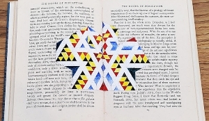 “The exhibition also brings together more than 40 works on paper made over the last 30 years, drawing on languages of signwriting, 1970s subculture, album covers and poster-art, as well as Baroque painting, Renaissance frescoes, Islamic mosaics and early modern artists and movements including Kandinsky, Klee, De Stijl, Mondrian, and Russian Constructivism. Some of these works are made directly into the pages of books, another kind of site, surface or architecture for him to intervene in and occupy.”
