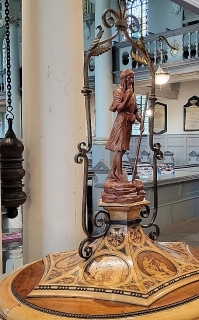 The small detail relates to the font that stands close to the main entrance to the church. It incorporates the bowl of the font that was originally constructed in 1745. The stem that supported it is elsewhere in the church. The font is covered by a wooden lid inlaid with religious images. On top of this cover there is a statue of st John the Baptist standing within a cast-iron frame. What we had not noticed before is that there is a lifting mechanism for raising the lid. This consists of a chain, which is attached to the top of the frame, and then runs over some pulleys, At the other end of the chain there is a heavy looking weight, presumably added to make it easier to raise the heavy cover.