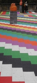 The flat roof has become employed as an open-air exhibition space for young artists. Today (December 2021), we climbed the stairs to reach the roof and were amazed to see that it has been covered with multi-coloured painting and plastic floor tiles, a dramatic sight. There is also a colourful hut, “The Artist’s Hut”, a modern take on the traditional cabman’s shelter. With the title “Back in the Air: A Meditation on Higher Ground”, the art installation was created by London-based artist Lakwena Maciver (born 1986). Also on this coloured space, there are a couple of ceramic works by another artist, Camilla Bliss. It is a wonderful surprise to see this field of bright colours, especially beneath a cloudy, grey sky. It would be fun to see the space from the air. But I do not know whether the pigeons would agree with me.
