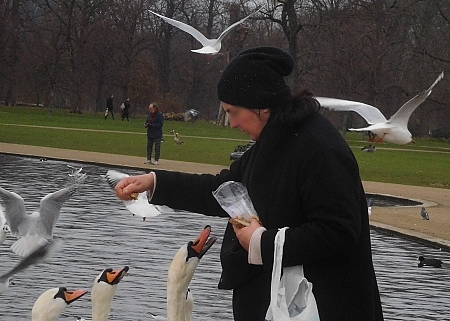 THE TEMPERATURE HAS dropped. Fear of the Omicron variant of the covid19 virus has meant that less people are out and about in London. This was the case in Kensington Gardens today, the winter solstice. The wildfowl that gather around its not so round Round Pond wait eagerly for visitors to distribute tasty morsels. Today, I saw a lady feeding the birds. So many were attracted to her that sometimes her head seemed lost in a cloud of noisy gulls. In front of her, swans extended their necks, attempting to reach her hands. Undaunted, this animal lover continued carrying out her kind gesture.