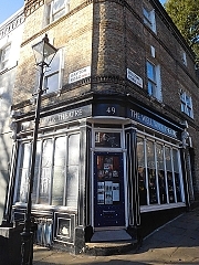 At the west end of Well Walk in Hampstead, near the lower end of Flask Walk, there is a corner building with a Georgian shop front. It is now a small theatre but was once the Well Walk Pottery, which occupied this place for many years. The pottery was started by the potter Christopher Magarshack in 1959. According to Bohm and Norrie, writing in their “Hampstead: London Hill Town”, published in 1980, Elsie, the widow of the Russian Jewish translator and writer David Magarshack (1899-1977), lived there. She bought this corner building, which had formerly been Sidney Spall’s grocery shop in 1957, for Christopher to use as his pottery. His father, David, left his birthplace Riga, then in Russia in 1918 and later lived above the shop. Elsie died in 1999, aged 100. In addition to selling pottery there, the pottery also held classes for ceramicists, some of whom now have good reputations. David’s daughter Stella, a fine artist, was the Head Art Teacher at King Alfred’s, a ‘progressive’ school situated between Hampstead and Golders Green. In 2016, aged 87, she was brutally attacked in the street close to her home. Now, the premises is to be home to a theatrical enterprise, The Wells Theatre. Its present owners have decorated one of its windows has been decorated with a pictorial history of the premises.