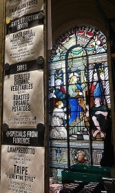 And this is what has been done at the former St Mark’s in Mayfair. Many of the church’s fittings (for example, the tiled floors, the stained glass, the monuments, the pulpit, and the sacred paintings at the east end of the chancel) have been preserved. Entering the church is like entering the scene of a lively gargantuan feast. Seeing the large number of customers on a weekday lunchtime demonstrates that Mercato Metropolitano have successfully created a great place to meet, eat, and drink. It is highly original and exciting, both visually and gastronomically.