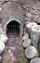 LONDON’S PARKS ARE filled with surprises of historical interest. The Terrace Gardens overlooking a bend in the River Thames at Richmond are no exception. A short path leads from a larger one to a cave in the side of a well vegetated slope. The entrance to the cave is topped with a semi-circular arch and its is closed by a locked iron gate. There is little to be seen inside the small cave. The pathway leading to the entrance is lined by barrel shaped concrete blocks