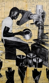Many of the works on display are gigantic collages, which from afar look like interesting abstracts or even modern tapestries. Closer examination of these reveals that the artist has glued fragments of photographs onto a background of usually either old maps of his country and/or a latticework consisting of numerous production order dockets issued by The Ghana Industrial Holding Company. Photographs of fruit bats in various poses often run around the fringes of the collages or appear within their main body. Photographs of aspects of life in Ghana are glued onto the backgrounds. Often, they have been trimmed so that the backgrounds intrude, and the photographs appear to merge or mingle with them. I felt that this was particularly effective when the map backgrounds mingled with the trimmed photographs, making me think that the maps were being brought to life. Also, they give the impression of modern Ghana emerging from the out-of-date maps. I was also impressed by one collage showing images of flying bats glued onto a sea of old order dockets: wildlife contrasting with man’s industrial enterprise.