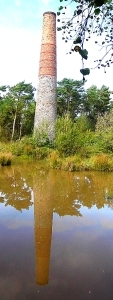 A SOLITARY CHIMNEY stands in the middle of East Harptree Woods in the Mendip Hills of Somerset, not far from Bristol and Bath. This tall, not quite vertical, chimney and the surrounding uneven landscape is all that remains of the local tin and zinc mining activities in the area. Known as Smitham Chimney, this was built in the 19th century and was the exhaust for the toxic fumes created by the furnaces smelting lead-bearing materials. The unevenness of the surrounding area, now richly populated with a variety of trees, was caused by the pits and spoil heaps created during the era of mining activity. The chimney was built in 1867 and by 1870, the East Harptree Lead Works Co Ltd were producing about 1000 tons of lead per year (https://en.wikipedia.org/wiki/Smitham_Chimney,_East_Harptree).