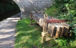 Our informant pointed out notches carved in the stonework near to a bridge. The notch is opposite another identical one across the canal. It is into these pairs of notches that the planks we had noticed ate inserted to create a dam, I regard myself as being quite observant, but I have never seen or noticed either this kind of notch or the wooden planks for inserting in them during many long walks along canals in other parts of England. Maybe, they are common, but until we walked beside the Macclesfield Canal, I had never seen them before, Maybe, this is because other methods of damming (see: https://www.rchs.org.uk/wp-content/uploads/2017/01/OP-128.pdf) are also employed in addition to that which we spotted on the Macclesfield Canal at Bollington in Cheshire.