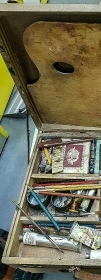 YOU NEVER KNOW WHAT you might find by chance. While sorting through possessions in our storage unit, or ‘go-down’ as it is called in Indian English, I came across a wooden case. It contains artists’ paint brushes; tubes of oil paint, already used; pencils sharpened with a knife rather than a sharpener; a portable palette stained with usage; a couple of glass bottles; a tin containing Fortis brand thumb tacks (made in the USA); and various other items used for creating oil paintings. One of the pencils is marked “sanguine”. Pencils of this type are like charcoal sticks but a little harder. They can be used to draw lines and are also smudgeable. On the lid of the box, there is a label issued by the Union Castle shipping line. It informs us that the case was travelling Cabin Class in Cabin number 464 on the Pretoria Castle from Cape Town to South Africa. The name of its owner is “BS Yamey”.
