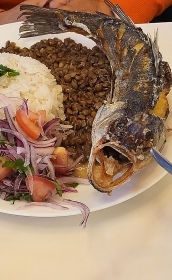 While strolling along Peckham’s busy Rye Lane, we came across the entrance to Rye Lane Market. After entering it and walking along an arcade lined with shops, we arrived in a large, covered area filled with food stalls: a food court. Unlike many other food courts, the food outlets were not branches of well-known chains. Instead, there were stalls catering to the multi-ethnic local population. We sat down at a table that was surrounded by stalls serving Mexican, Carribean, Colombian, and other many cuisines. We ordered the set lunch offered by a small Peruvian kitchen. As first courses, we ate cold boiled potatoes dressed in a red pepper flavoured mayonnaise and a delicately flavoured beef soup. These were followed by a fried rice dish containing chicken, pork, and smoked sausages, and another consisting of a whole fish beautifully fried, served with lentils, rice, and a salad containing onions, lime juice, coriander, and tomatoes. Freshly prepared and reasonably priced, everything was delicious.