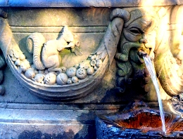 The reason that this spot, favoured by Mr Bowles, was and still is, always sodden is that it surrounds a natural spring, which issues from a cylindrical stone well-head covered with stone carvings. These include depictions of a squirrel, a fish, and the head of a man with a luxuriant moustache. The water issues from a pipe emerging from the man’s mouth and then drops into a carving of a scallop shell before some of it falls into a drainage grid and the rest all over the place.