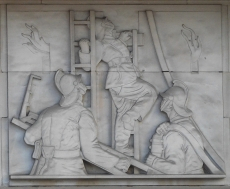 The doorways, which are wide enough to admit the passage of vehicles are closed with sets of folding doors, consisting of four panels, each of which has a brass window covering (grille) with a geometric design. Some of the building’s decorative panels depict firefighters at work. These are in bas-relief and made of a white coloured stone. These were made by Nicholas Babb (probably Stanley Nicholson Babb; 1873-1957). Other panels, at a higher level, adorn the central section of the façade. These are also bas-relief in white stone but have backgrounds formed of gold coloured mosaic tiles. Created by Gilbert Bayes (1872-1953), who studied alongside Babb at the Royal Academy, their subject matter is borrowed from ancient mythology.