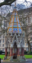 The Buxton Memorial Fountain is a small but colourful, exuberant, firework-like example of the Gothic Revival style. Standing on an octagonal stone base, it is made with a large variety of materials. Its pyramidical roof is covered with patterned tiles in many colours. Four red coloured stone drinking fountains, which no longer function, surround a central speckled granite column that supports a fan-vaulted ceiling, which any cathedral would be pleased to include in its structure. From the memorial there is a fine view of the Houses of Parliament, another superb example of Gothic Revival, but somewhat less flamboyant than Teulon’s much smaller structure.