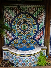 The Morroccan Garden, an exquisite part of the Meanwhile Gardens, was opened by Councillor Victoria Borwick on behalf of the local Moroccan community in 2007. It celebrates the achievements of that community and is open for all to enjoy. A straight path of patterned black and white tiling leads from the main path across a small lawn to a wall. A colourful mosaic with geometric patterning and a small fountain is attached to the wall, creating the illusion that a tiny part of Morocco has been transported into the Meanwhile Gardens. Nearby, there are a few seats for visitors to enjoy this tiny enclave in the gardens.