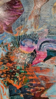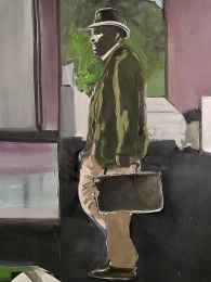 In 2015, Noah was diagnosed with a rare but usually lethal carcinoma. Even while lying in bed in hospital, he continued to create images. In fact, he made 70 wonderful small works (many of them experiments in abstraction) while undergoing treatment for the disease that tragically ended his life. Many of these works are shown in the exhibition. During the month before his death, he made three large canvases, each one expressing his anticipation of his life’s imminent ending. One depicts two girls asleep on a sofa. This picture honours togetherness and restfulness. Another depicts a funeral. And the third shows a man walking in front of self-storage lockers. This image represents the loneliness in which each of us leaves the world of the living.