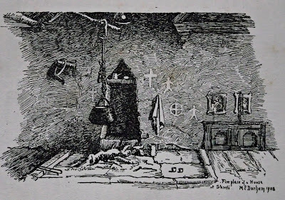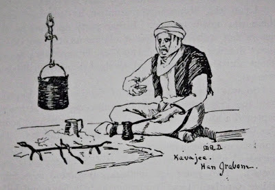 The first of these two shows the interior of a house in Skreli, in the northern highlands of Albania. The crosses drawn on the wall next to the hearth indicate that the house was home to some of the many Albanian Roman Catholics who lived in the area. The second of these, the kavajee or coffee-maker, shows him holding the jezva, in which Turkish-style coffee is brewed, in one hand and the cup into which it will be served in the other. The next picture shows Durham's skill in depicting architecture.