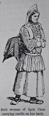 As Gowing's book relates much about Durham' s visits to Kosovo, I have decided to include some of the pictures from High Albania that were drawn whilst Edith was there. Here is one showing a Serbian woman from Ipek carrying a cradle on her back: