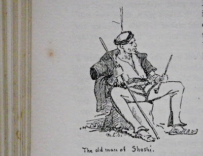 Today, visiting the monastery is not as simple as it was when I visited in 1990 (see my recently published book about Yugoslavia Scrabble with Slivovitz - click here ). When Elizabeth Gowing visited it, the Serbian monasteries in Kosovo had become like tiny rocks in a vast sea of Albanians. Surrounded by razor wire fences and guarded by heavily armed militia to protect these islets of Serbian culture from the Albanians, who rightly or wrongly lose little love for the Serbs, entry to them is subject to intensive identity checking and might be denied. The last of my examples of Durham's drawings brings us back to northern Albania, which is the main subject of High Albania. It shows an old man of Shoshi, which is somewhere north of Albania's River Drin that flows towards its mouth near to Shkodra.