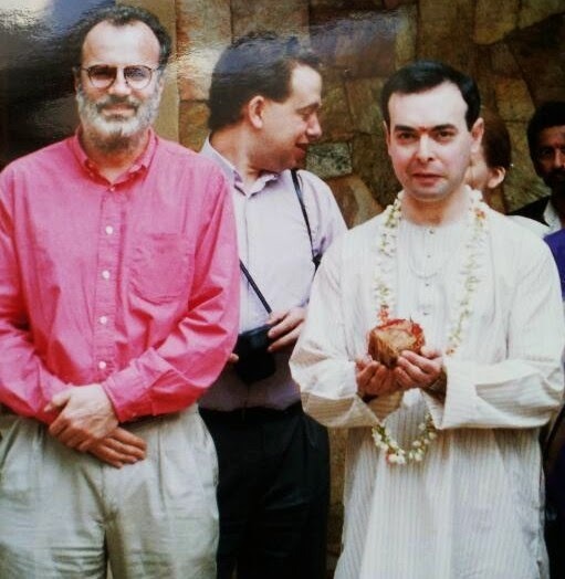 Michael Jacobs (in pink shirt) with Adam Yamey (in white robes and holding a coconut) in India, 1994