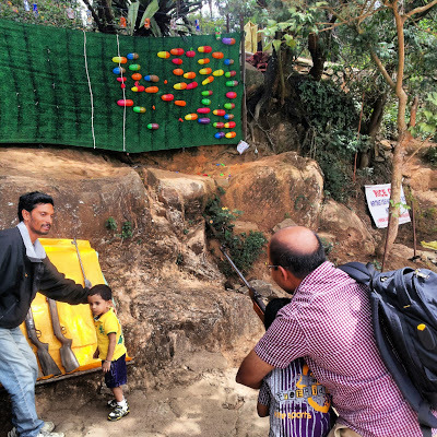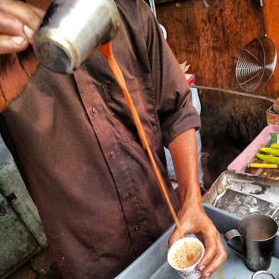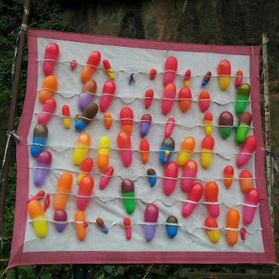 It was in fact a collection of balloons that formed a shooting range for visitors to test their skills as marksmen. There was a line of stalls near the falls. They offered a variety of things for visitors. We selected one of the many tea-stalls at random and bought cups of ginger tea. This is made with freshly crushed root ginger, milk, tea powder, sugar, and powdered dried ginger. After this lot has been boiled up, it is strained through a cloth filter, and poured into cups. Here is our tea being cooled: