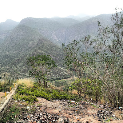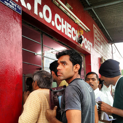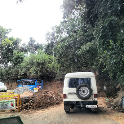 These pictures were taken before a 'decent' road , the Law's Road was opened in 1916. We travelled in a brand new Suzuki Dezire from Bangalore. After leaving our daughter at Bangalore's international airport at 4.30 am, our driver Hanumaya drove us southwards right across Bangalore toward the Karnataka/Tamil Nadu border, which we reached soon after sunrise. We stopped at the RTO 'check-post' at Zuzuwadi, which is on the outskirts of Hosur, and after a long delay our driver paid the 100 Rupee tax that allowed us to drive in Tamil Nadu.