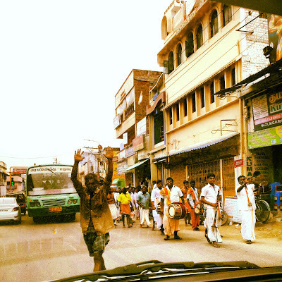 After several hair-raising hours of dare-devil driving, we reached Dindigul, where we left the motorway. Had Hanumaya been less tired, we would have entered this town. We decided to visit it on our return. We joined the road that led towards Kodaikanal. It was not a dual carrigeway, but this did not mean that our driver needed to reduce his speed; he did not. We drove on westwards until we reached the small town of Periyakulam in which there was a huge traffic jam because a festival was in progress: