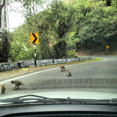 We realised that we had missed the turning for the ghat road leading up to Kodaikanal, and made a u-turn in the midst of all the festive chaos around us. After an anxious 20 minute drive retracing our steps we saw the sign to Kodaikanal and began ascending the winding road that was to take us up to 2500 metres above sea-level. At first, the road was quite good. Every now and then we encountered troupes of monkeys sitting by the roadside. They scattered away as we sped towards them.