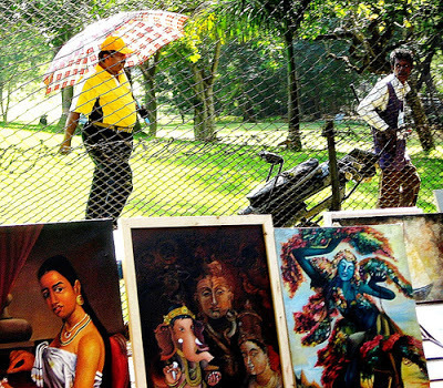Until a few years ago, the CP became the nucleus of one of the most wonderful art events in Bangalore, Chitra Santhe. This event used to be held on the last Sunday of each year. The whole of Kumara Krupa Road was closed off to vehicular traffic. Artists lined the road with stalls from which they sold their works of art. Some were professional, many were students. We bought many beautifully painted watercolours from them over the years. Sadly, this event is no longer held. I do hope that it will be re-instated as soon as possible! The picture below was taken at one of these events.