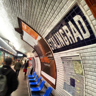 To celebrate our 20th wedding anniversary, we decided to visit Paris. Before setting off on the Eurostar train at London's St Pancras Station, I had some misgivings about revisiting a city which I had visited many times before. As soon as I stepped out of the metro train that took us from Gare du Nord to Place St Michel, these misgivings evaporated. Far from making me feel blasé, the sights of the city uplifted my soul. I felt as if I was seeing the city anew. I was filled with wonder. After taking possession of our room at the Hotel Esmeralda on the Rue St Julien le Pauvre - its window provided an excellent view of the north side of Notre Dame - we took the metro to the station named 'Stalingrad'.